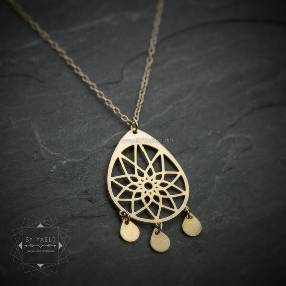 This drop shape mandala dream catcher necklace was inspired by the shape of the mandala - a symbol that is taking the world by storm